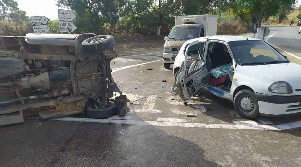 تمثل في اصطدام ما بين سيارة سياحية من نوع Clio 2 و شاحنتين صغيرتين من نوع DFM خلف اصابة خمسة أشخاص اثنان منهم لهما إصابات خطيرة على مستوى الرأس وثلاثة لهم ألام و كسور في مختلف أنحاء الجسم .